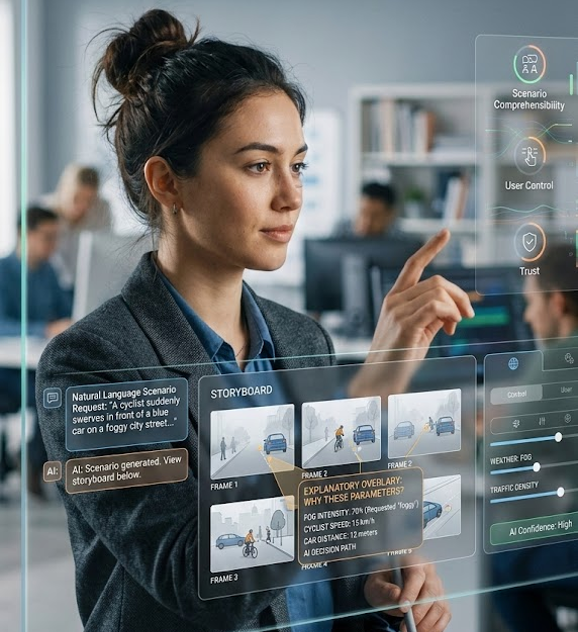 In this project, students will design interactive interfaces that bridge natural-language generation, storyboard visualization, and explainable AI. They will develop a prototype that integrates conversational scenario creation, storyboard-based scenario representation, and explanatory overlays or narratives. Students will evaluate the impact of these interfaces on scenario comprehensibility, user control, trust, and error detection.