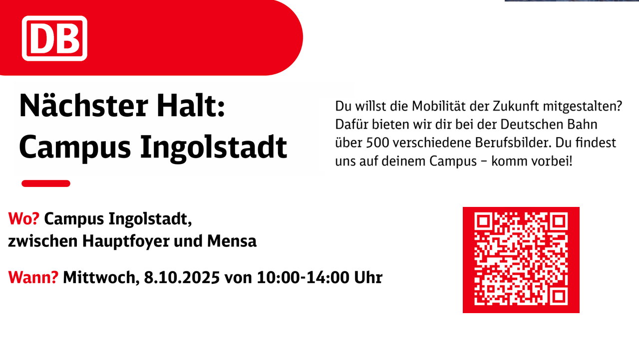 Mittwoch, 8.10.2025 von 10:00 bis 14:00 Uhr Nächster Halt: Campus Ingolstadt. Hier finden Sie mehr Informationen